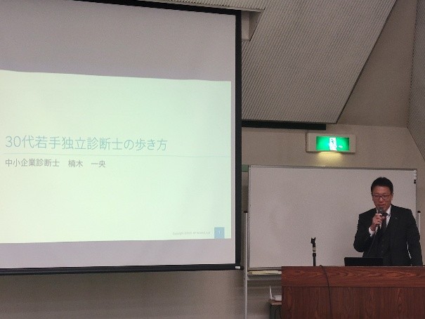 東京プロコン塾では1年のカリキュラムの中で数回、卒塾生の先輩からの講話を行っています。今回は16期、独立5年目の楠木一央先生から「30代の若手独立診断士の歩き方」のご講義をいただきました。楠木先生はイベント会社の運営をしながら独立診断士としても活躍されており、右肩上がりでの成長を実現されています。独立してからどのような戦略で紹介案件や民民契約を増やしてきたかについて詳しく説明していただきました。