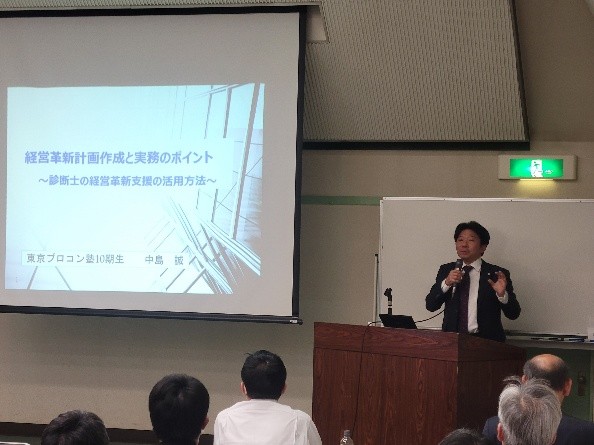 そして、お昼の時間を挟んで、10期の卒塾生でもある中島誠先生から「経営革新計画作成と実務のポイント」についてご講義いただきました。先月の創業支援に続き、企業のライフサイクルでいえば成長期にあたる企業が新規事業や新しい経営課題の解決、競争力強化のために取り組む経営革新計画について、窓口相談などの豊富な経験に基づき解説いただきました。経営者からのヒアリングから腹落ちする計画策定の提案を行うことができるか、計画にとどまらず実行支援につなげていくことができるかも重要です。中島先生が実際に関わられた事例に基づく2つのワークを通じて貴重なノウハウを受け取ることができた塾生も多かったのではないでしょうか。